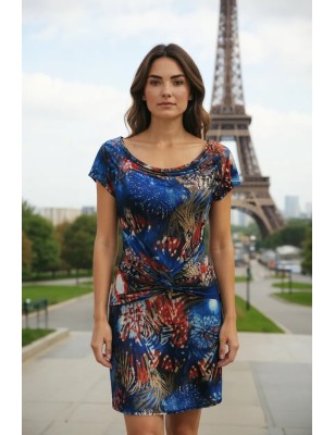 Draped dress with a red and blue constellation print