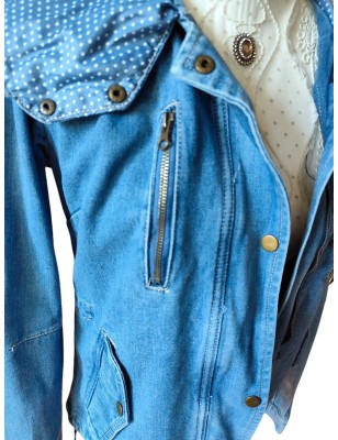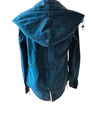 Veste longue en jean bleu clair avec capuche, elle se cintre de l'intérieur.